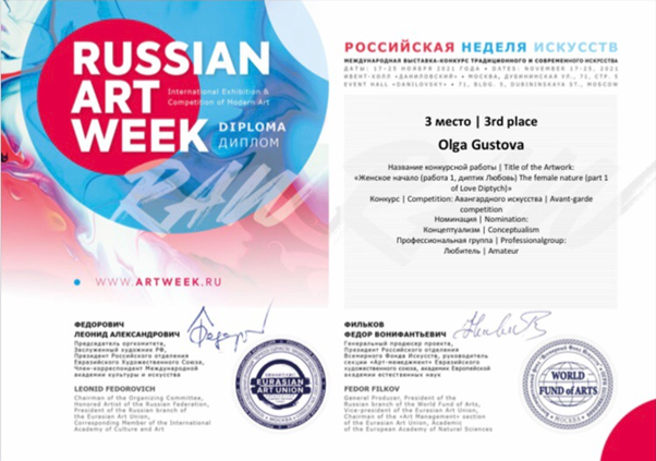 - December 2021 International Exhibition (Fair and Competition) Artweek Moscow (www.artweek.ru). 1st and 3d place in Avangard Art/Conceptualism competition.