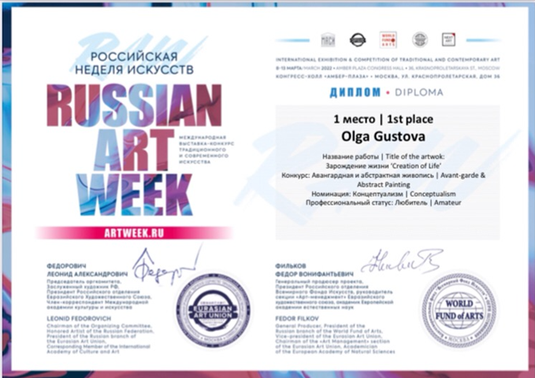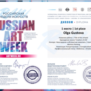 - March 2022 International Exhibition (Fair and Competition) Artweek Moscow (www.artweek.ru). 1st place in Avangard Art/Conceptualism competition.